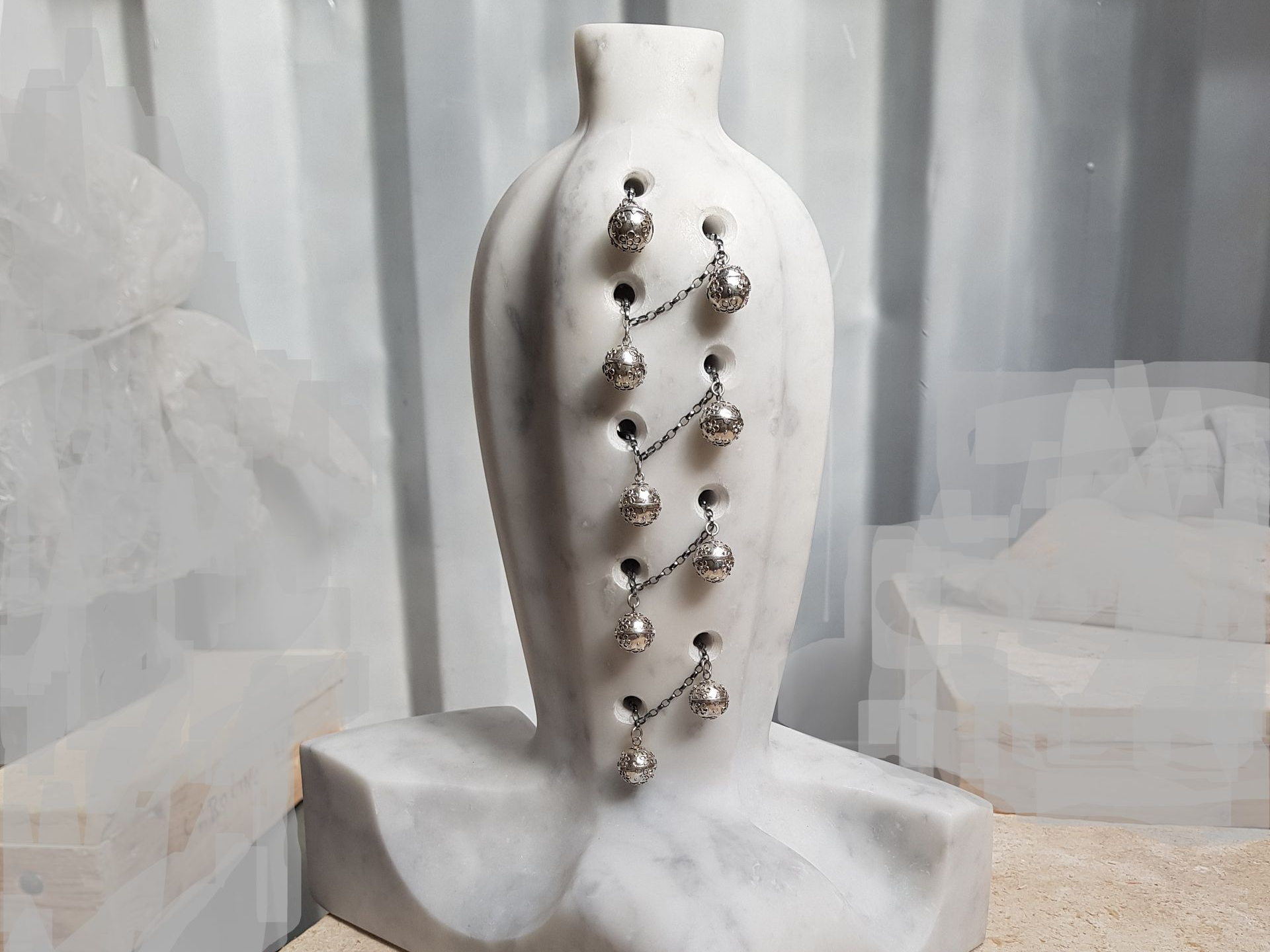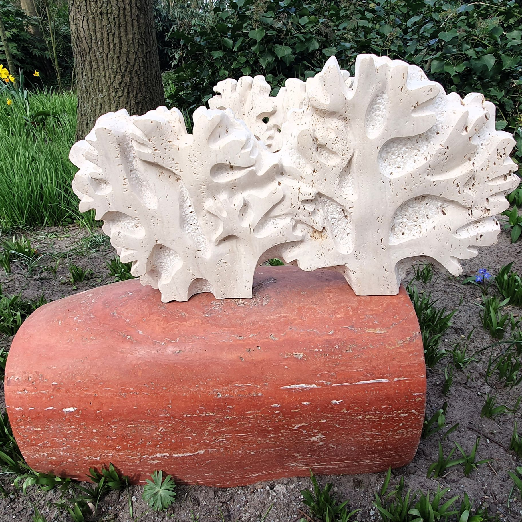 Marmeren figuur op kalkstenen bewerkte plaat.